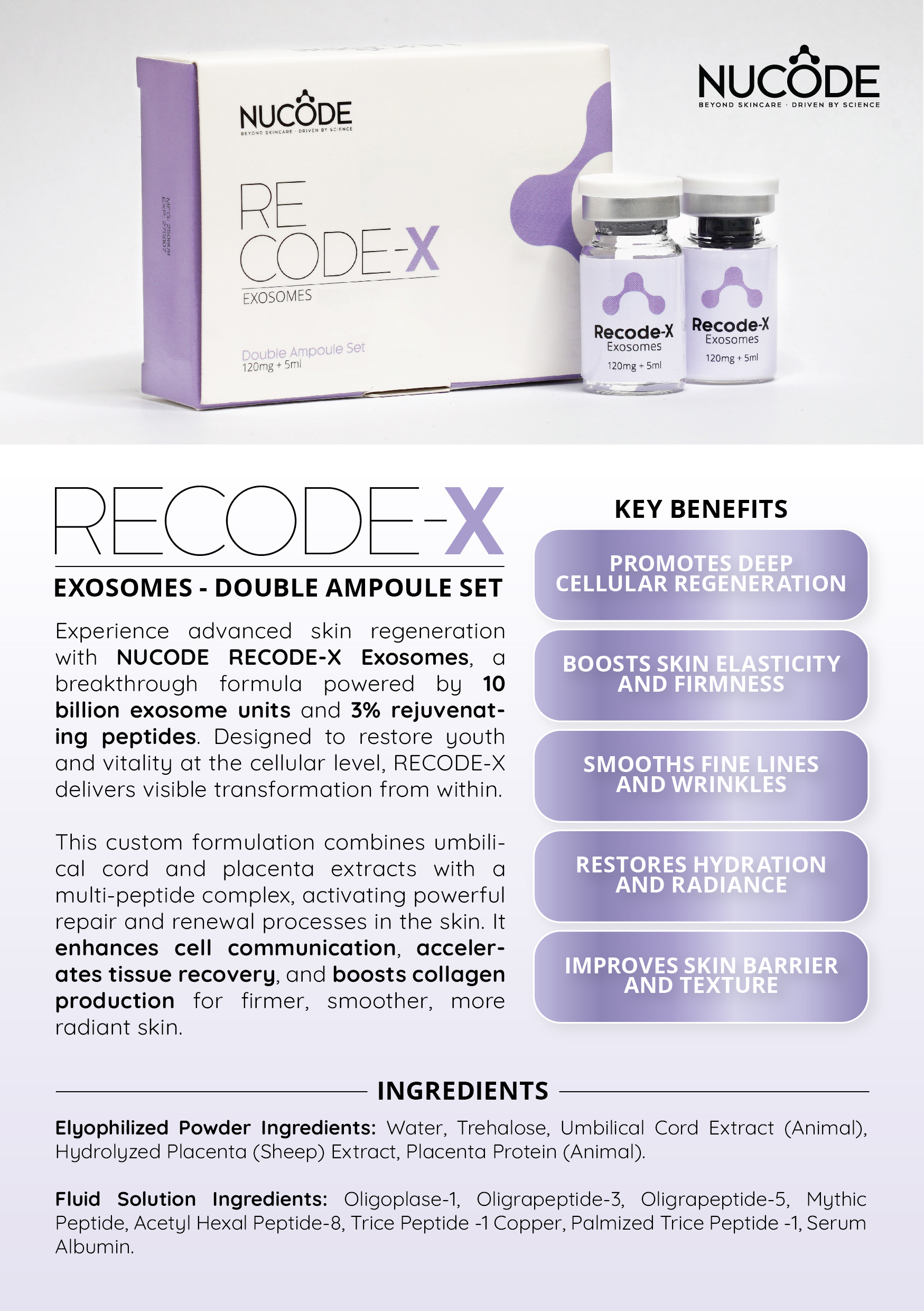 Experience advanced skin regeneration with NUCODE RECODE-X Exosomes, a breakthrough formula powered by 10 billion exosome units and 3% rejuvenating peptides. Designed to restore youth and vitality at the cellular level, RECODE-X delivers visible transformation from within.