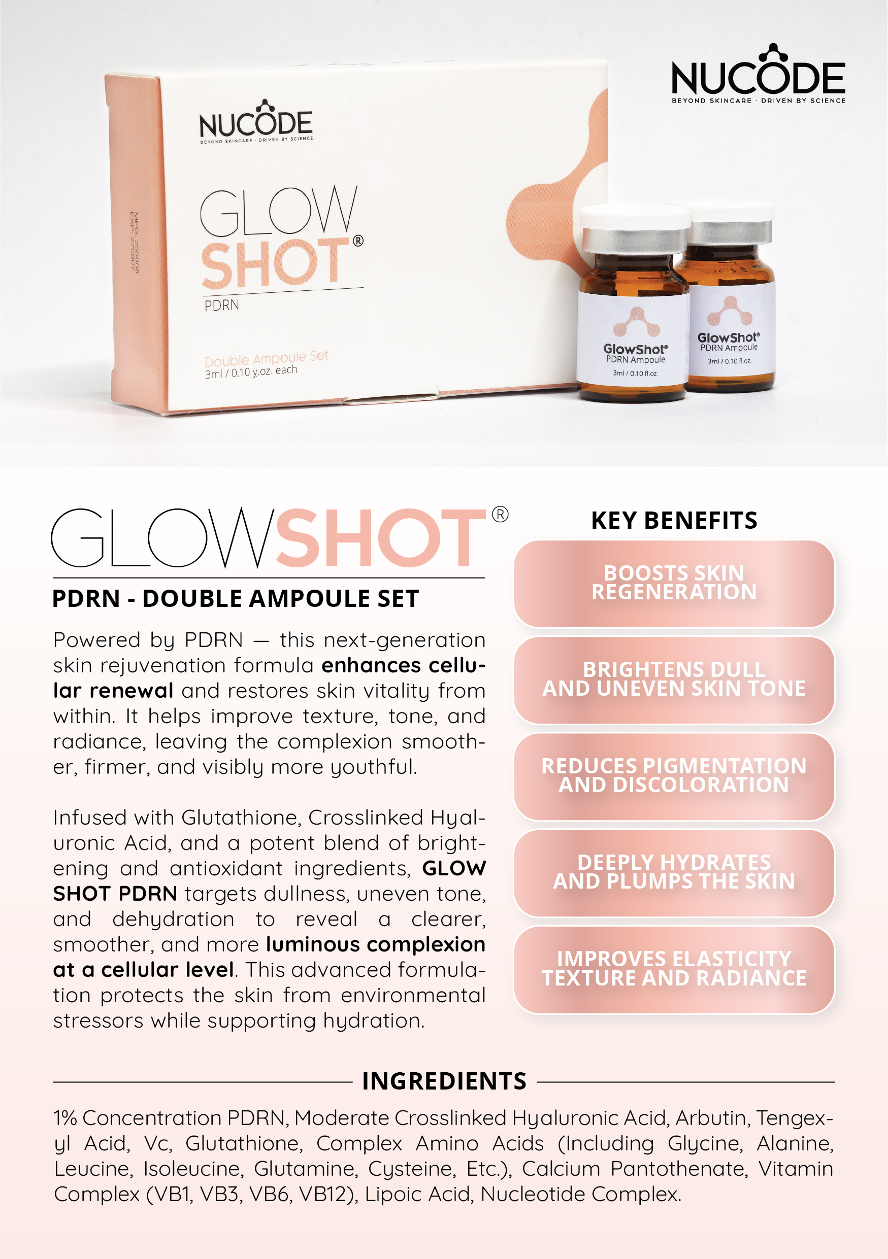 Infused with Glutathione, Crosslinked Hyaluronic Acid, and a potent blend of brightening and antioxidant ingredients, GLOW SHOT PDRN targets dullness, uneven tone, and dehydration to reveal a clearer, smoother, and more luminous complexion at a cellular level.